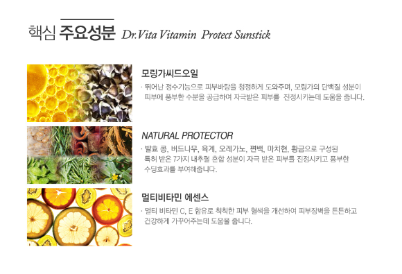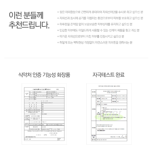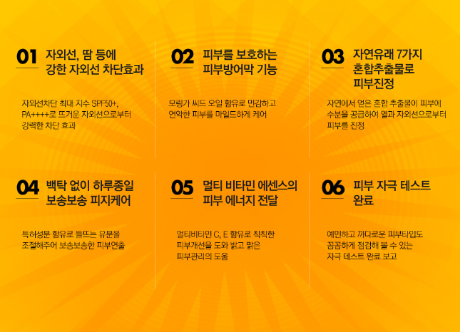 - SPF50+ / PA+++ - Finished unstimulated test - Anti pollution function to protect skin from yellow & fine dust / Natural protector(patent 10-0910747) - Pure vitamin / Sebum control / non irritant tested