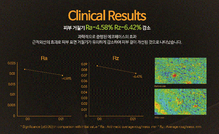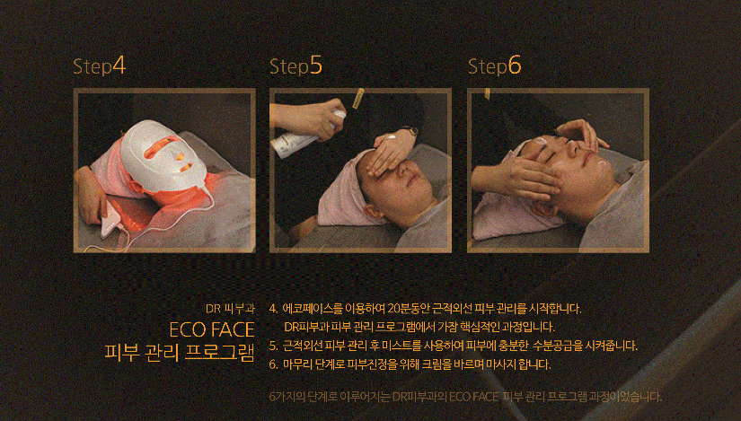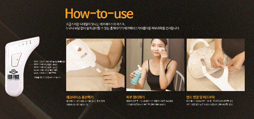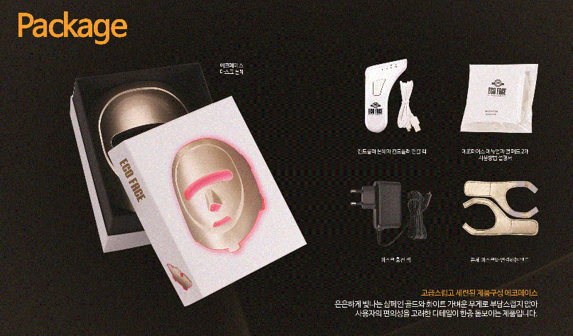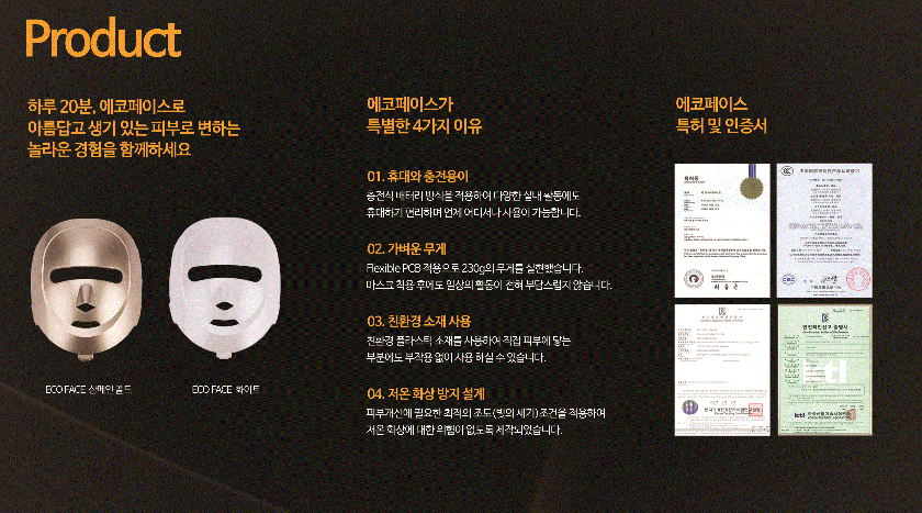 - 맑 고 깨끗한 피부로 변하는 멜라닌과 홍반감소 - 피부 속부터 차오르는 탄력 : 피부 탄력 부여 - 눈꼬리, 팔자주름 팽팽하게 노화예방 효과와주름개선 - 피부 속 깊이 침투하여 건강한피부로 개선 - 활력을 더해 화사한 피부 피부 미백 효과 - 항상 촉촉하고 부드럽게 수분량 증가 - 에코 페이스가 특별한 4가지 이유 * 휴대와 충전이 용이 * 가벼운 무게 * 친환경 소재 사용 * 저온 화상 방지 설계