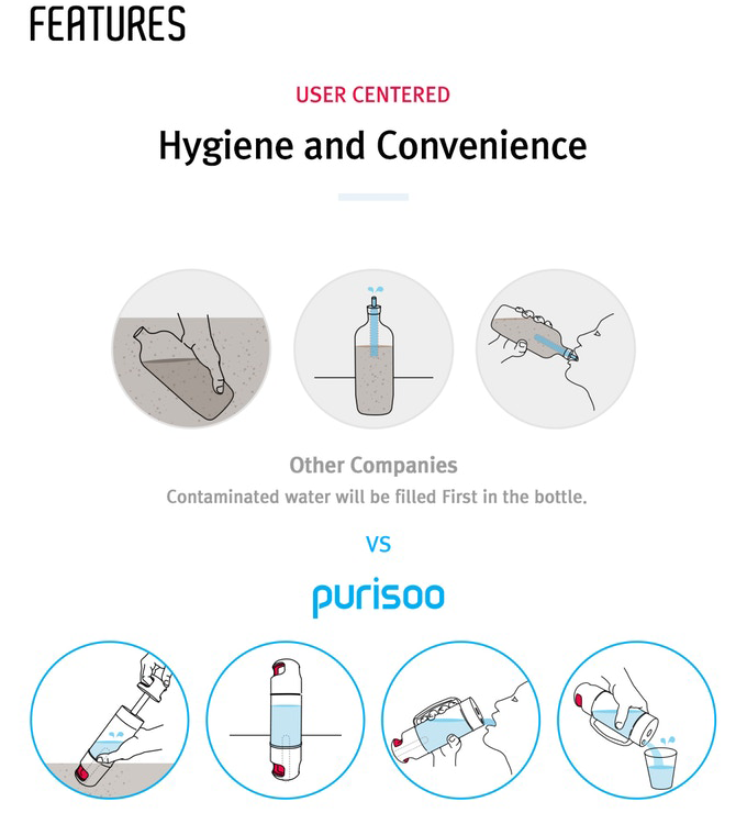 As an all-in-one purification/filter pump system and water bottle, Purisoo solves issues from which other portable water purifiers suffer.